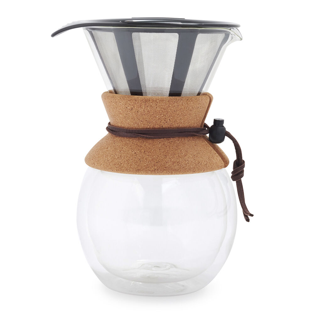 The creative minds at Bodum have made pourover coffee as easy to prepare as it is to enjoy. Simply add ground coffee and hot water and the coffee maker does the rest. A stay-cool cork grip with leather fastener brings natural beauty to this kitchen mainstay. Unlike paper filters, the fine mesh stainless steel filter is reusable and does not absorb the coffee’s essential oils, allowing its of true flavor to be extracted.