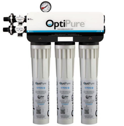 The Pentair QTI-3 is a triple-cartridge water treatment system with three 15″ Qwik-Twist cartridges, parallel-plumbed, that reduces sediment down to 0.5-microns, and reduces chlorine, taste & odor at a flow rate of 6.75 gpm for 67,500-gallons. The system includes IsoNet®, OptiPure’s patented scale inhibiting technology, which delivers consistent protection against the precipitation and accumulation of scale and provides a protective barrier to help guard against corrosion. |